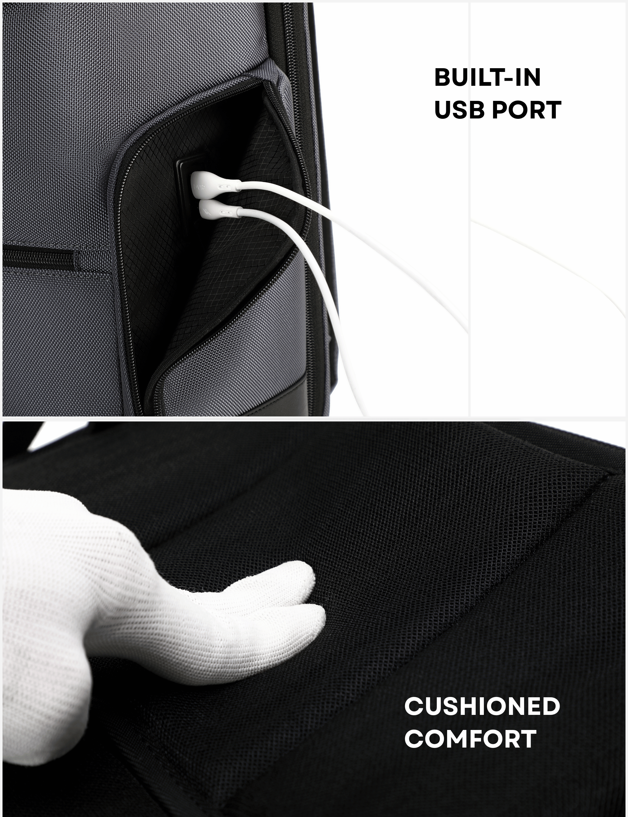 Smart tech pockets keep chargers, cables, and accessories neatly organized and within easy reach.